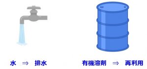 ドライクリーニングとランドリーの大きな違いは、使用するのが「水」であるか「溶剤」であるかです。さらに違うのは、使用後に「排水」するか、繰り返して「再利用」するかです。ドライクリーニングでは、洗浄によって汚れた溶剤を廃棄せず、「再生」して繰り返し使用します。そのため、溶剤の清浄度をいかに高く維持するかが重要です。