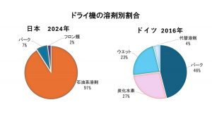 2024年度末時点での日本国内におけるドライ機の溶剤別割合は、石油機が91%(15,152台)と大半を占めています。パーク機が7%(1,084台)、製造中止となっているフッ素系溶剤のフロン機が2%(168台)です(厚生労働省調査)。残念ながら日本では、洗浄性に優れたパーク機の割合が非常に低い状況です。