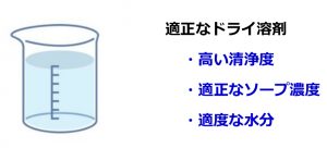 ドライクリーニングの品質においても、使用する「ドライ溶剤」が適正な状態であることが基本となります。適正なドライ溶剤とは、清浄度が高く、適量のソープと適度な水分を含んでいることです。